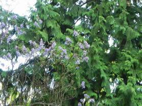 The impressive Empress Tree can be found in the northeast corner of the Nursery at Milner Gardens. The purple and yellow blossoms stand out against the dark green of the surrounding cedar trees.